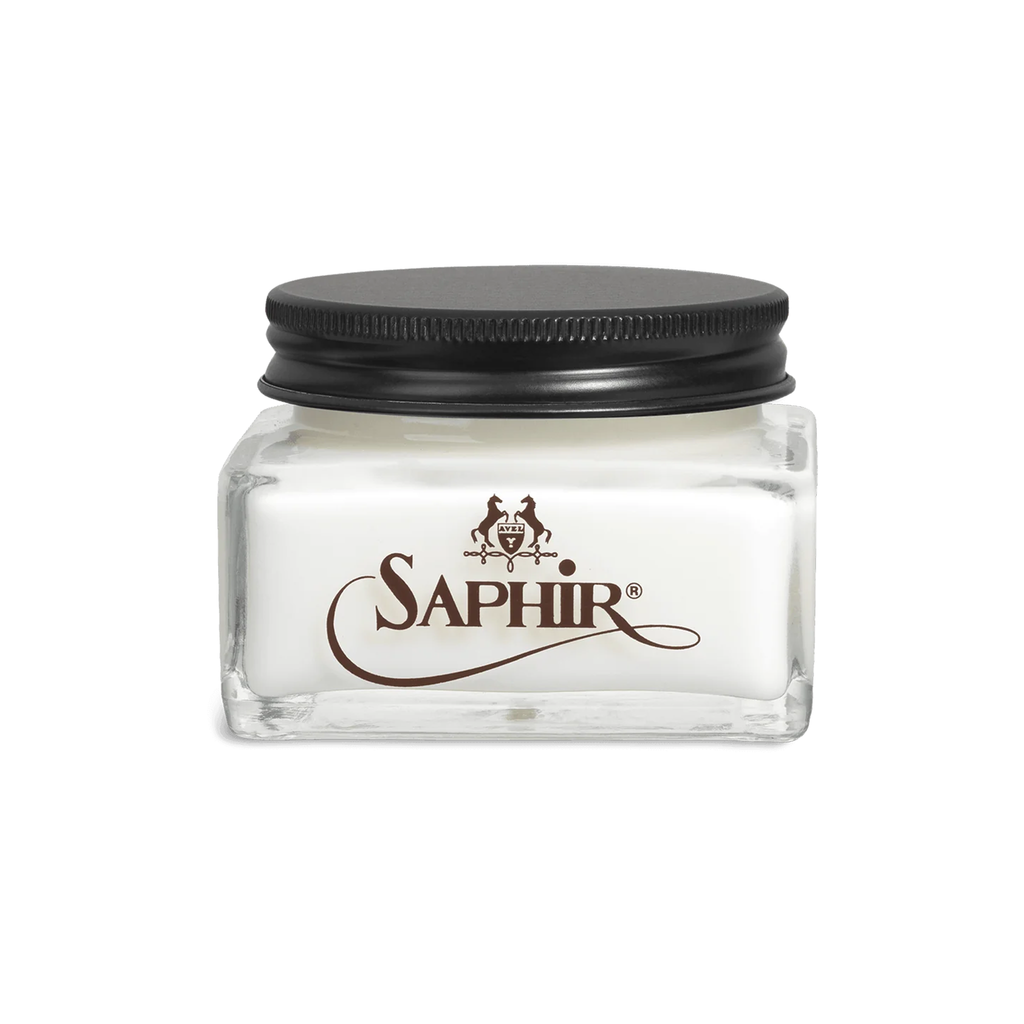 La crème saphir, aussi appelée pommadier, est un mélange de plusieurs cires et beurre de karité. Elle s'utilise pour revitaliser le cuir : le cuir de vos chaussures absorbe les nutriments de la crème et la cire le protège et fait briller. Vous pourrez l'appliquer avec une brosse spatule en crin de cheval.