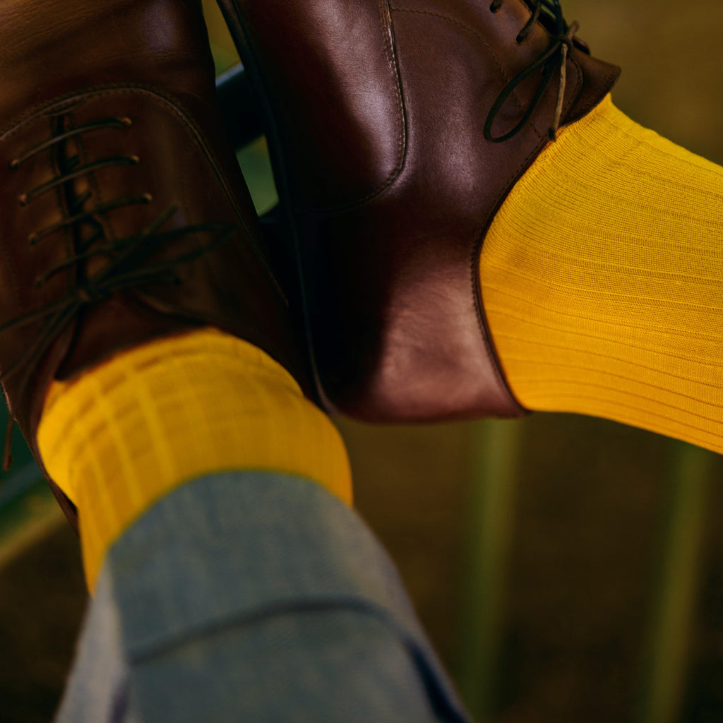 Les chaussettes jaunes sont un incontournable des chaussettes vives. Ces chaussettes jaunes en fil d'Écosse sont légères comme leur couleur. Les mi-bas 100% fil d'Écosse sont très confortables et appréciés. Ici, le jaune est chaleureux, un jaune poussin ou jaune or.