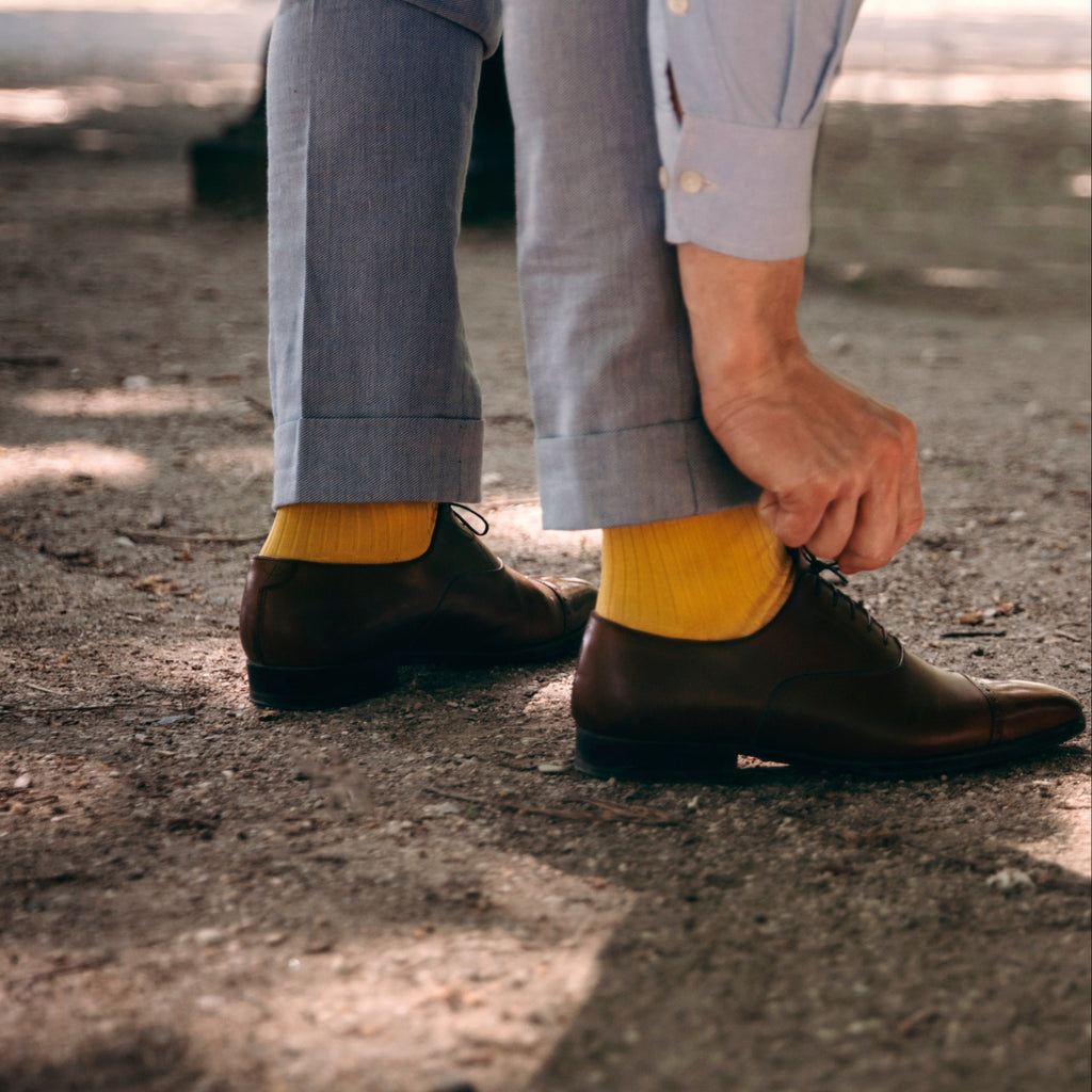 Le jaune n'est assurément pas une couleur de chaussettes banale. Les chaussettes mi-bas jaunes sont néanmoins adoptées par certains amateurs éclairés et audacieux. Les chaussettes jaunes se marient bien avec les autres couleurs claires, par exemple des chaussures en daim marron ou un jean. Vous pouvez aussi choisir le contraste avec des chaussures noires.