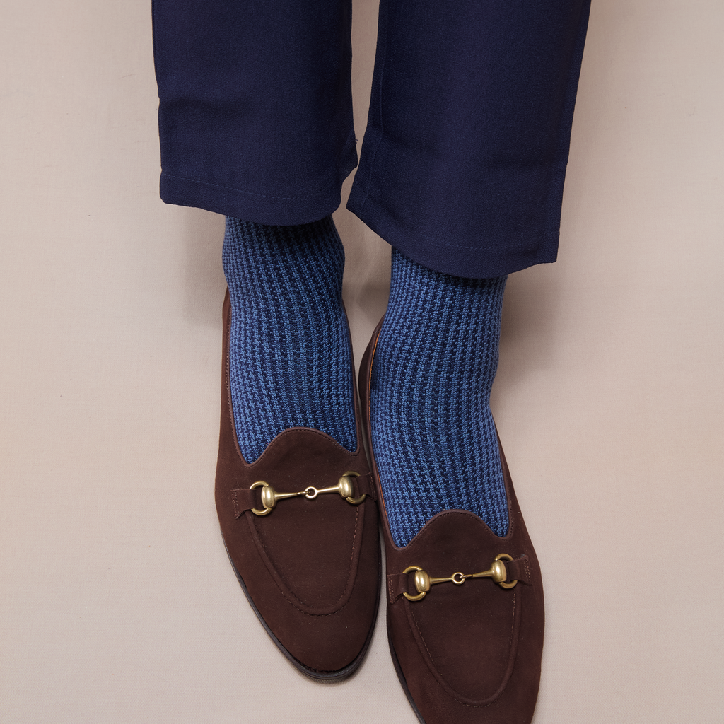 Le motif pied-de-poule, intemporel du vestiaire classique, s’invite sur ces élégantes chaussettes hautes. Ici décliné sur une base bleu marine avec des touches de bleu acier, il apporte une subtile note de contraste, parfaite pour compléter une tenue aux tons bleus.