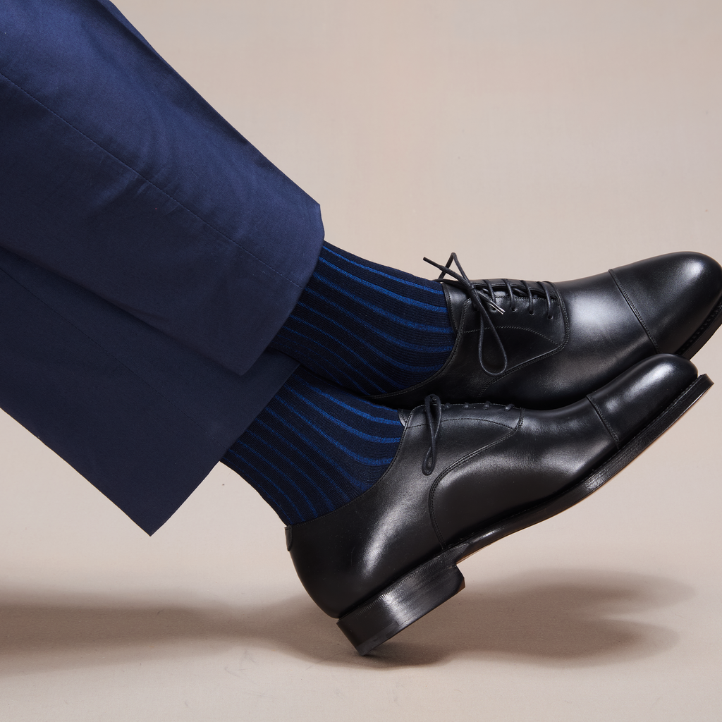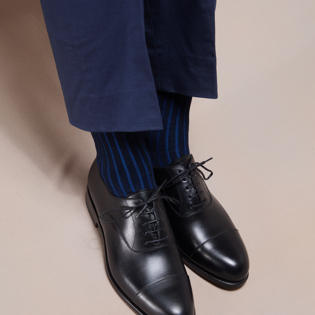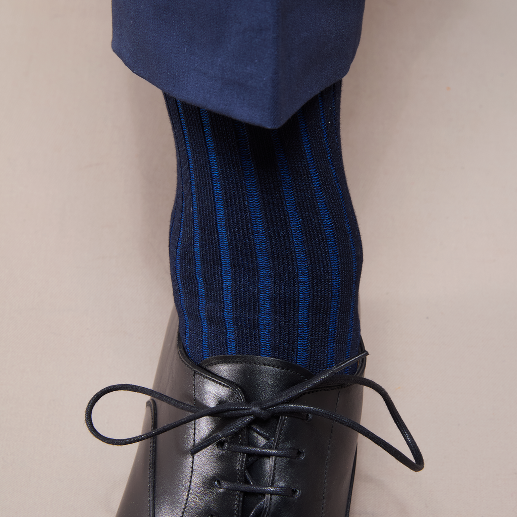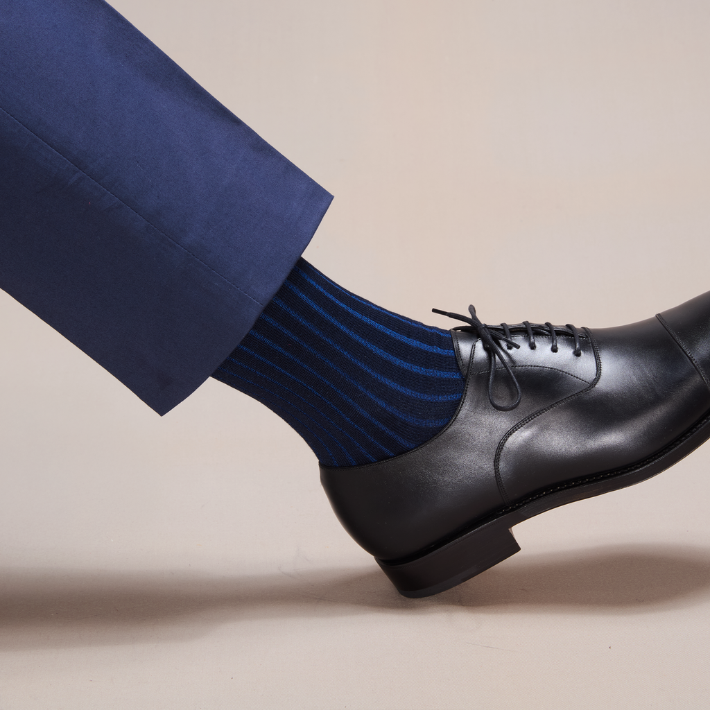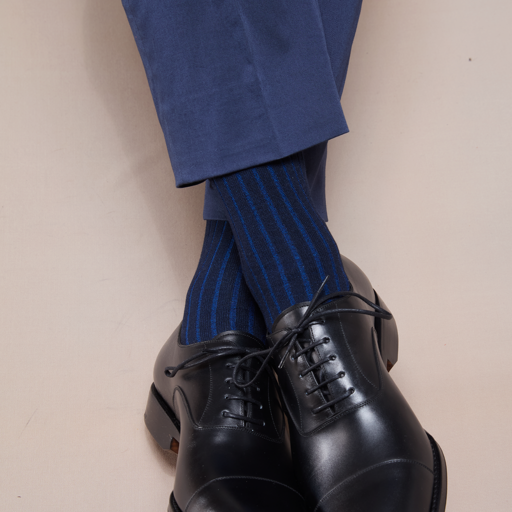 La finesse des côtes colorées de ces chaussettes vous permet d'oser les motifs sans pour autant qu'ils ne soient trop voyants. Les côtes bleu roi apportent une discrète touche lumineuse. Cette paire de chaussettes est une bonne alternative aux traditionnelles chaussettes bleu marine et reste très élégante.
