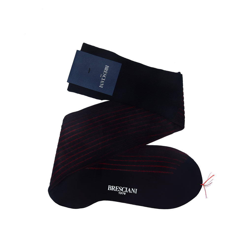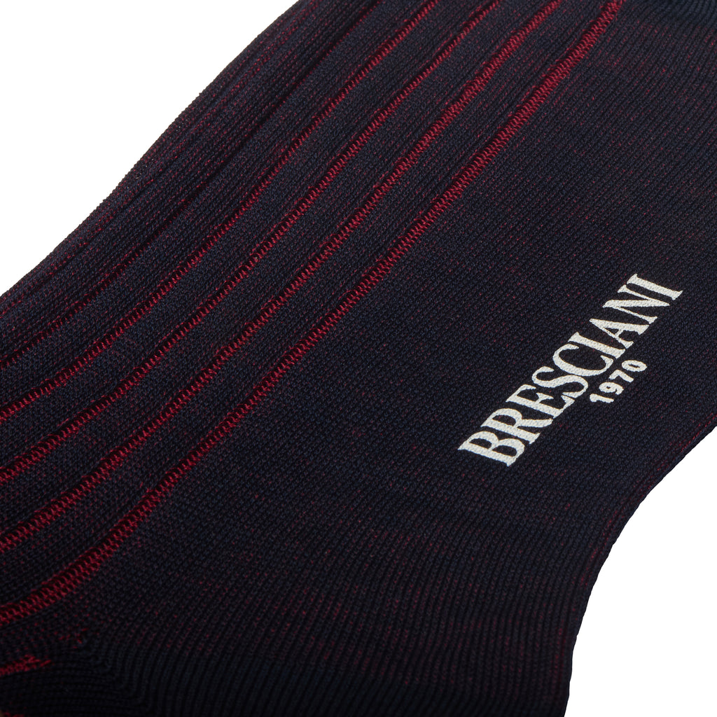 Chaussettes mi-bas (hautes) Bresciani à côtes rayées rouge et bleu marine. Ces chaussettes avec des côtes de couleur contrastée sont magnifiques. La côte rouge est ainsi soulignée et apporte une touche de fantaisie à la chaussette qui reste sobre avec le bleu marine.