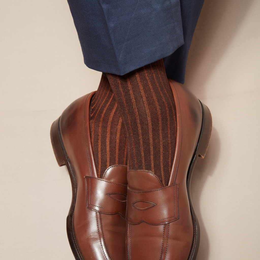 Cette paire de chaussettes extra-solides en fil d'Écosse s'accorde parfaitement avec des chaussures marron. Avec ces rayures orangées, vous pourrez également rappeler les tons cognac d'une paire de souliers plus clairs. Ce modèle est élégant et se porte avec une multitude de tenues.