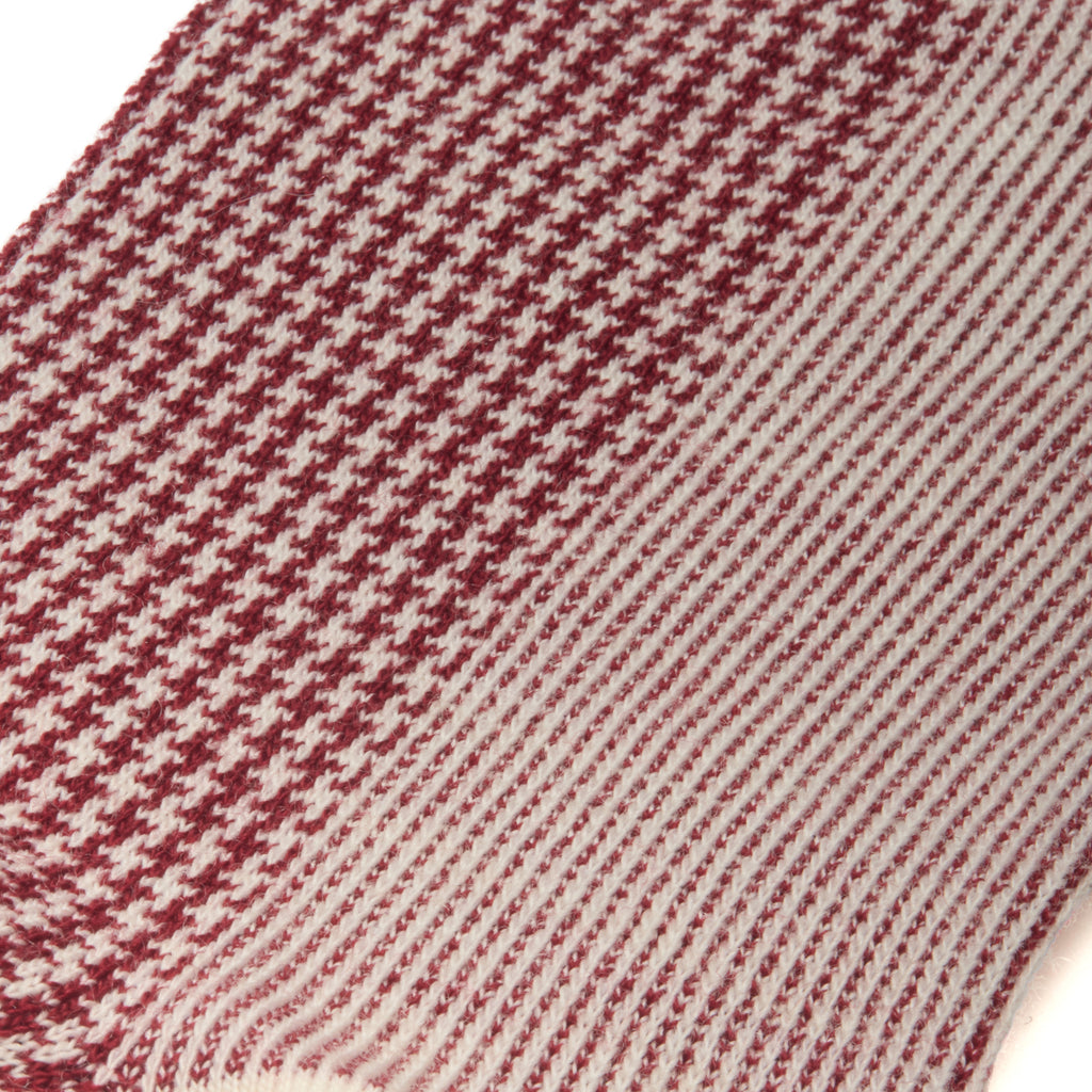 Le classique motif pied-de-poule est ici décliné dans une association audacieuse de blanc neige et de rouge grenat. L'usage d'une base claire permet de faire ressortir le motif parfaitement.