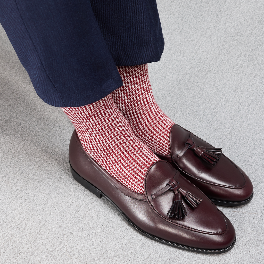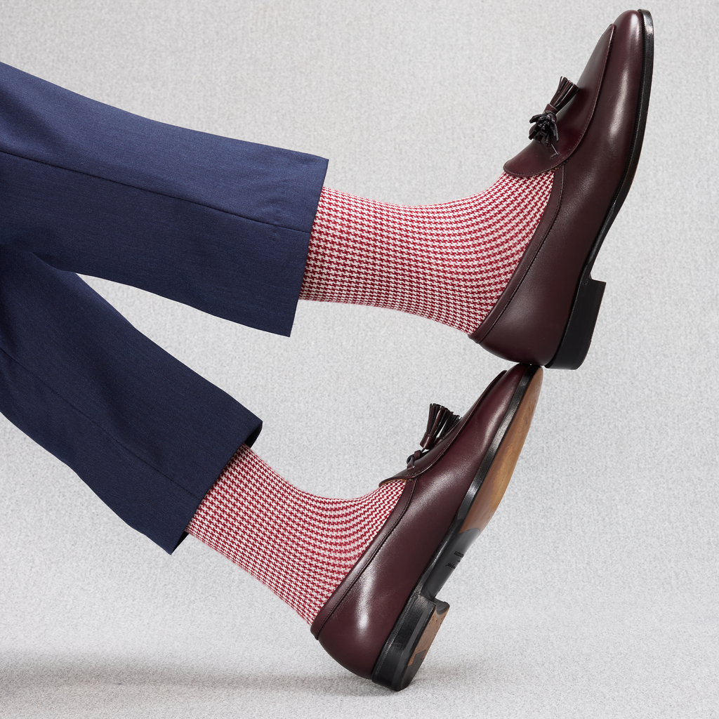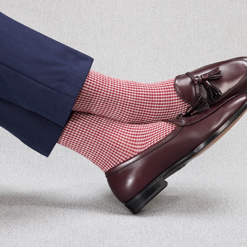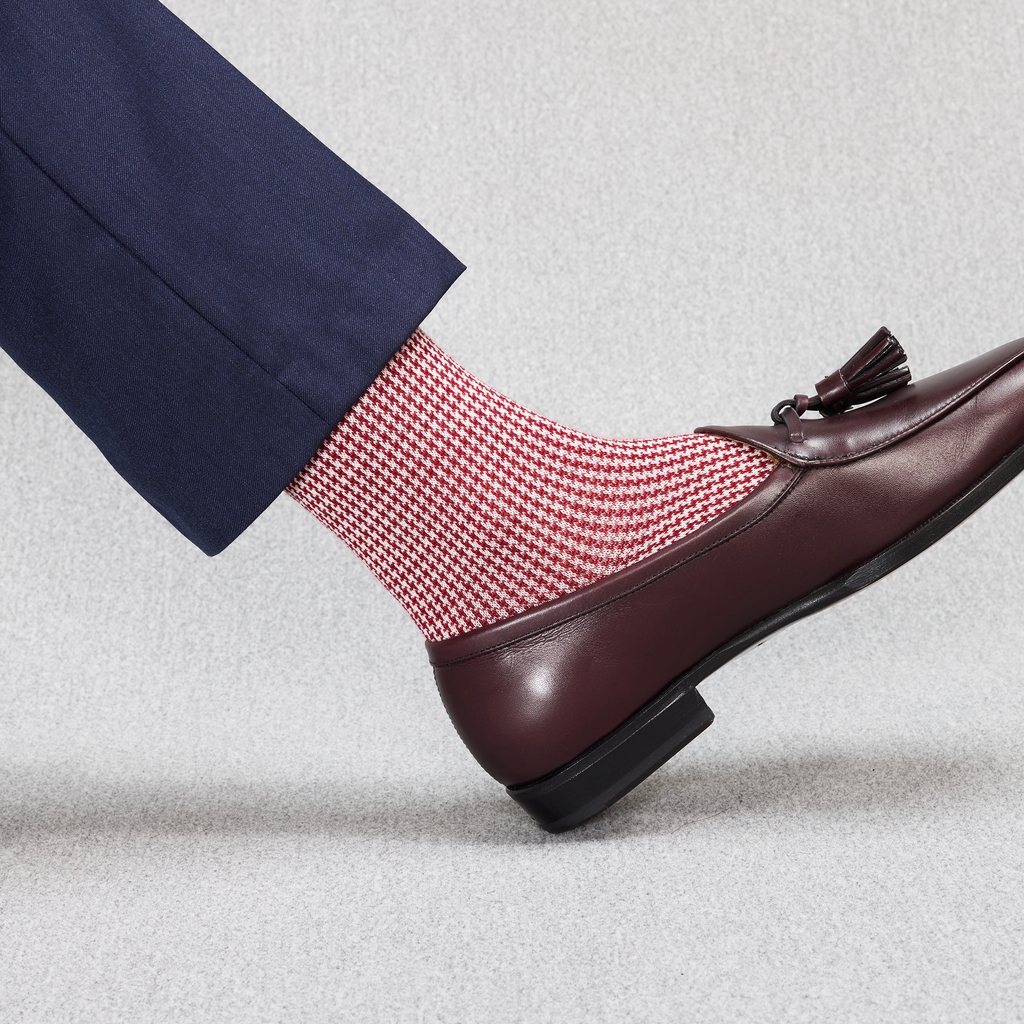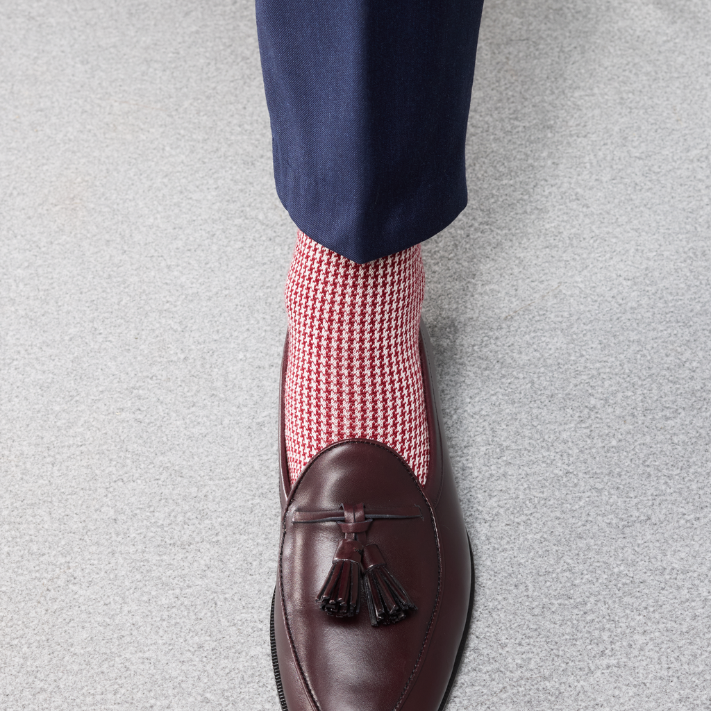 Chaussettes en laine Super-solide de couleur blanc neige à motif pied-de-poule rouge grenat, de la marque Mazarin.