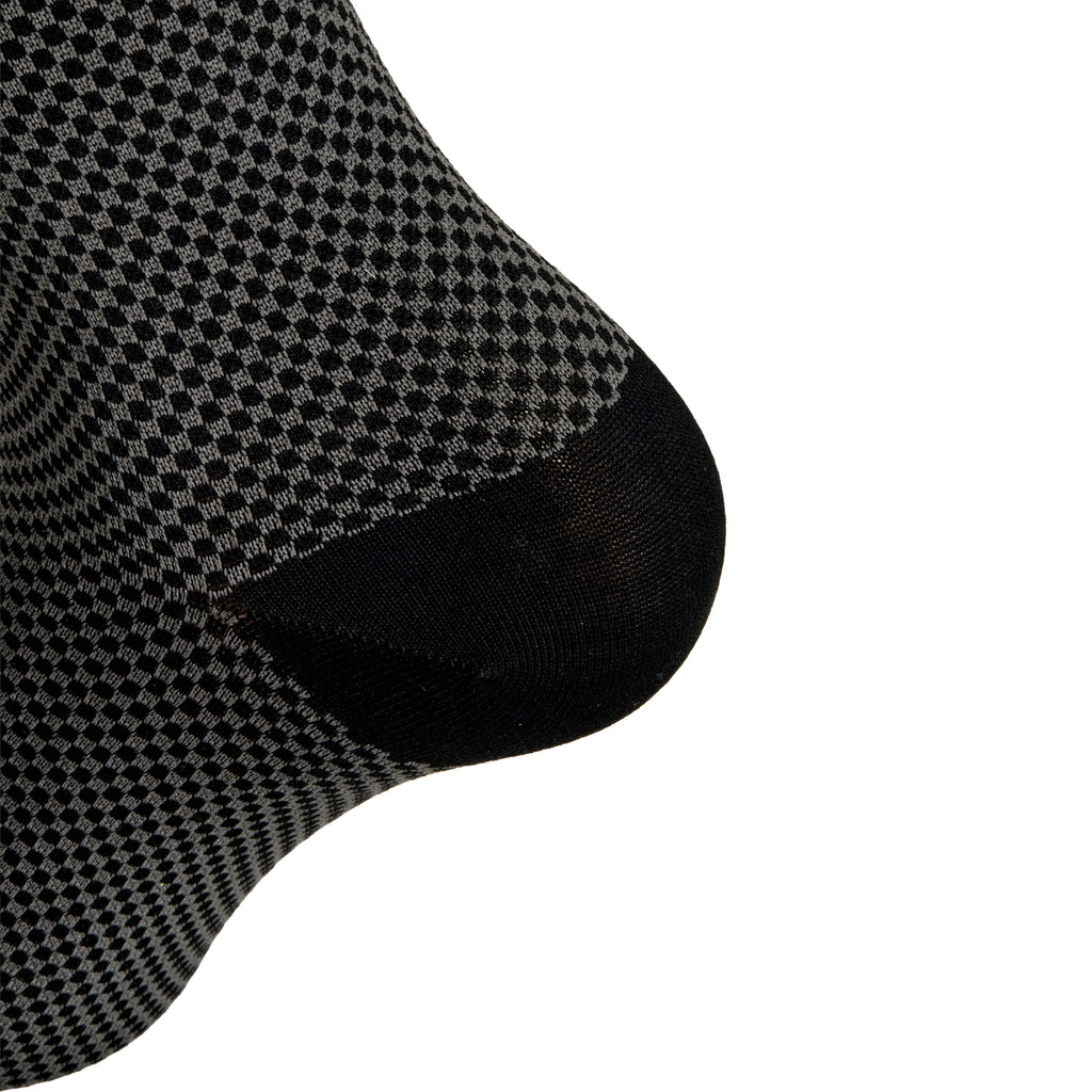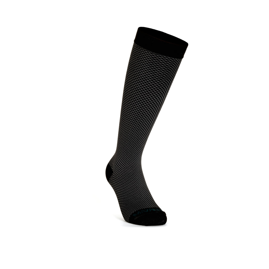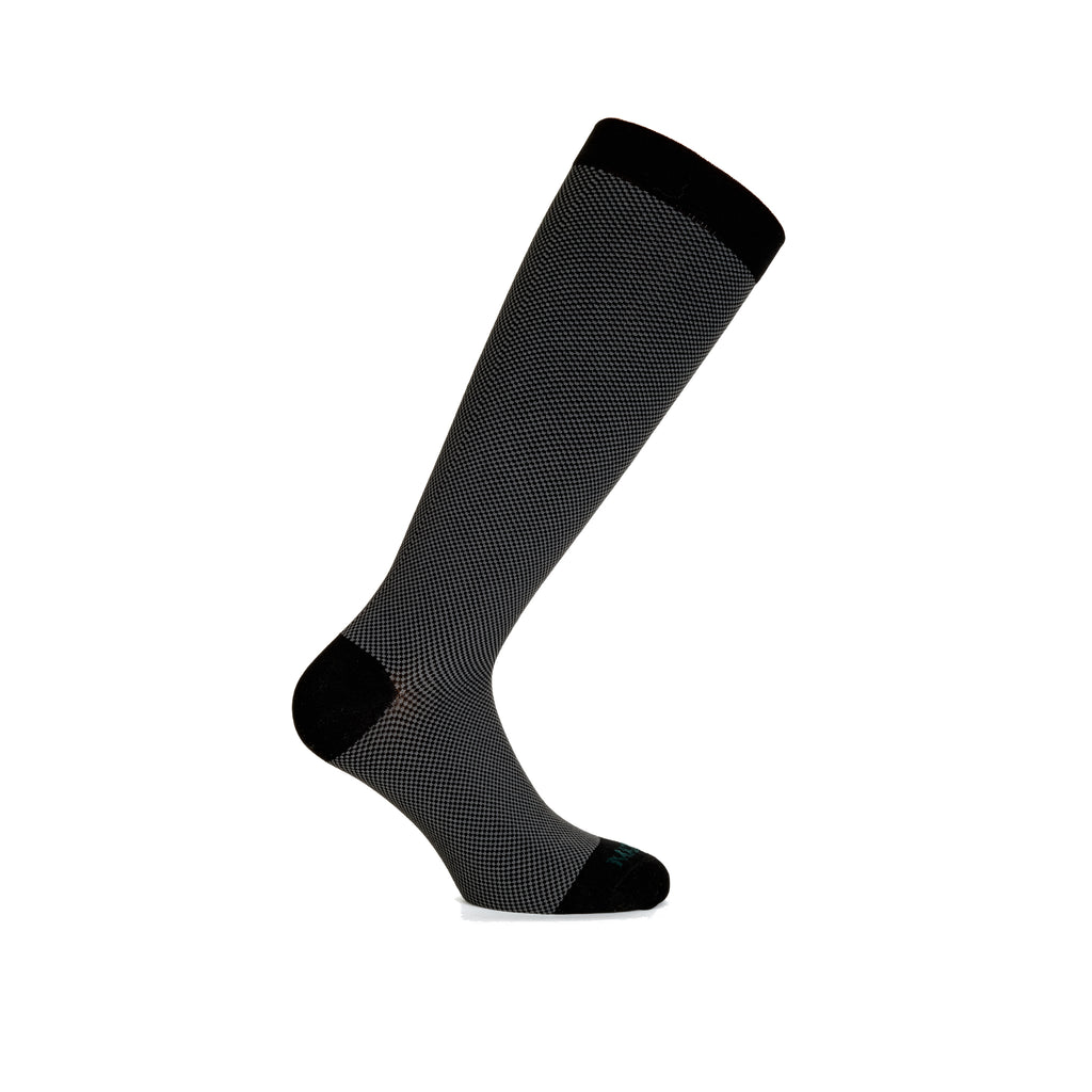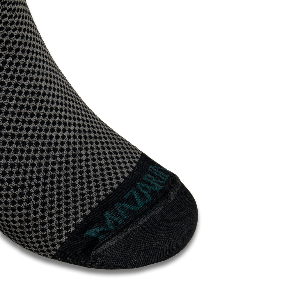 Mazarin revisite le classique de la chaussette de contention noir en y ajoutant une note de gris. Ce damier est une manière originale et discrète de porter des mi-bas de contention. Chics et élégantes, elles sont très faciles à porter.