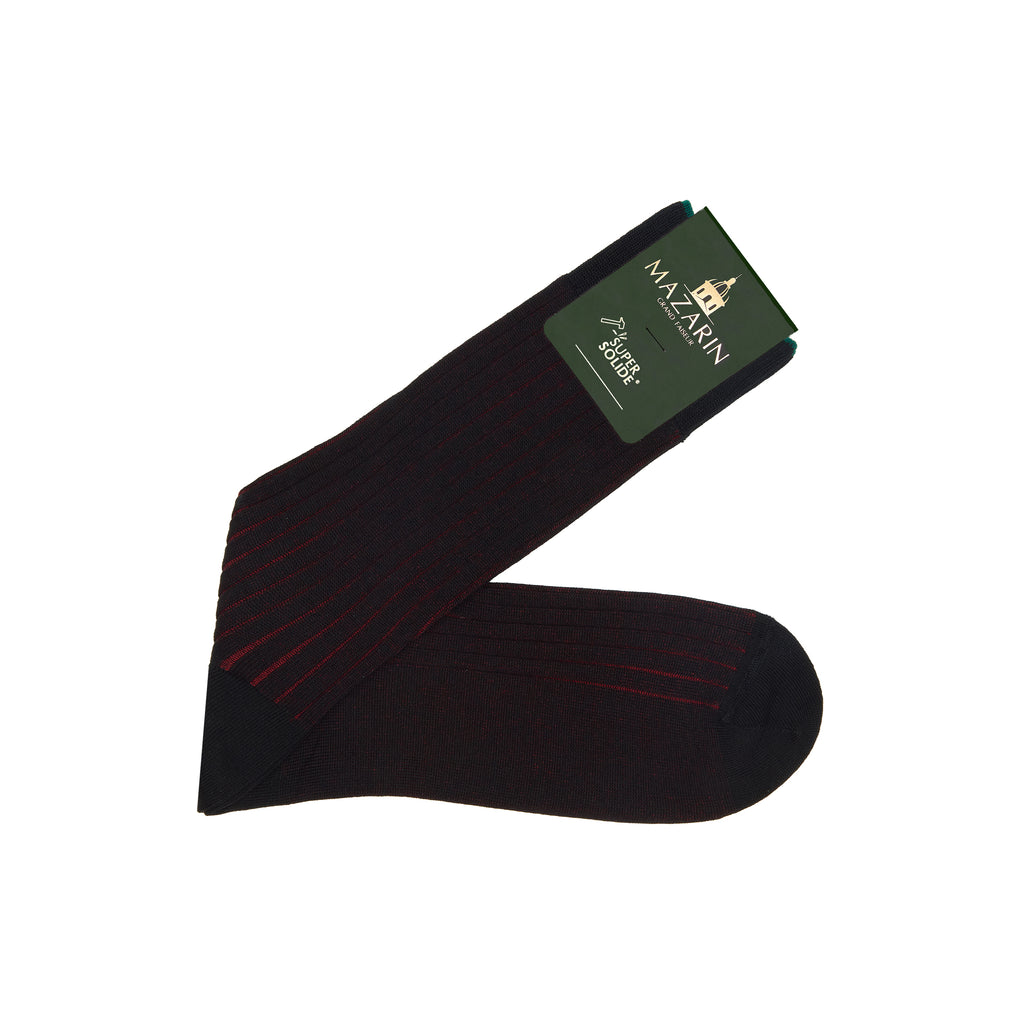 Chaussettes mi-hautes en fil d'Écosse de la gamme Super-solide par Mazarin, avec un motif de rayures noires et rouges.