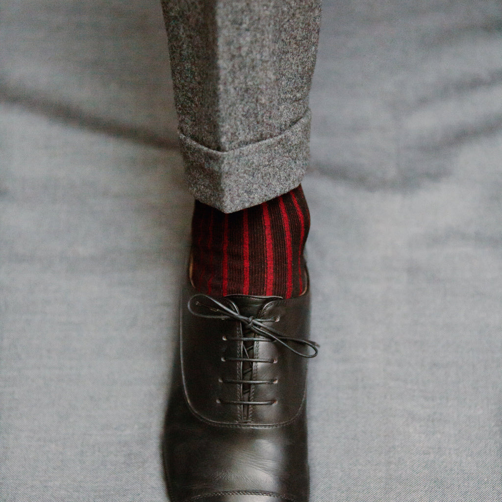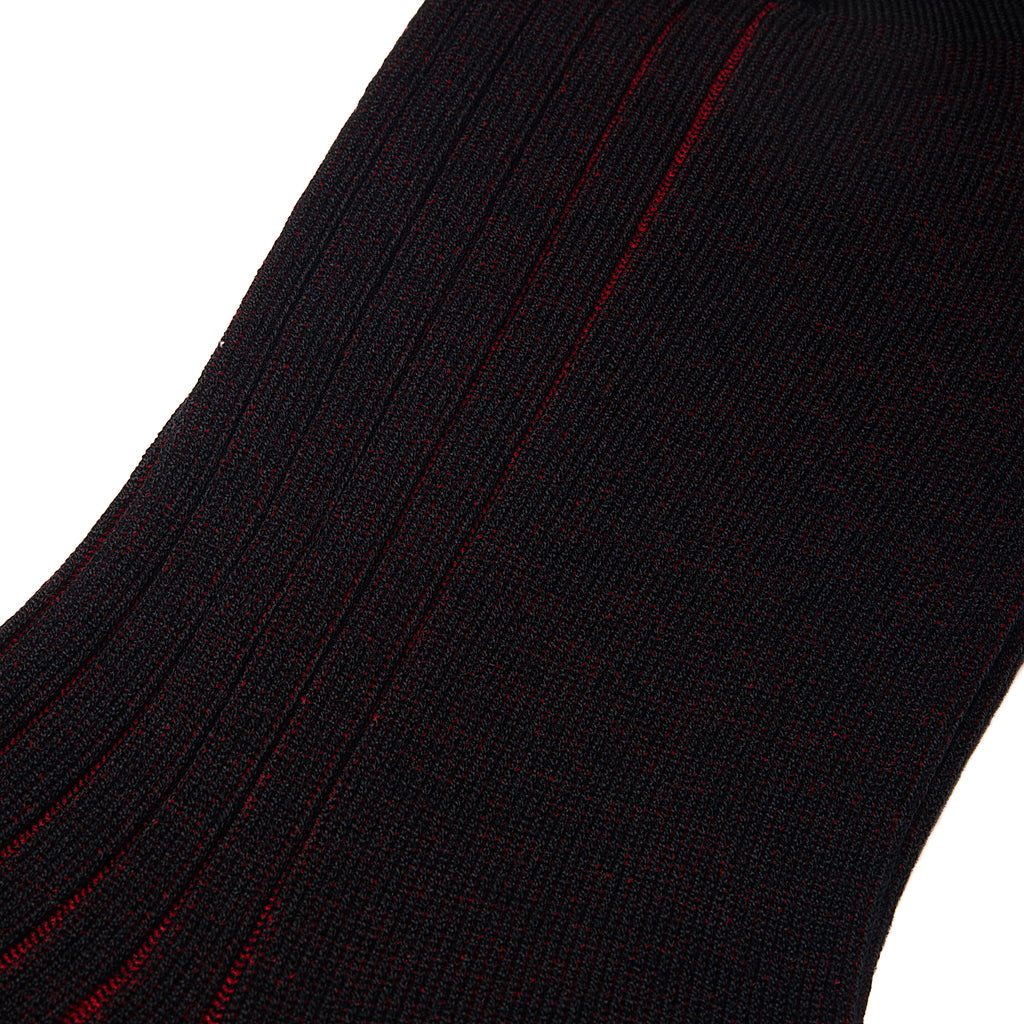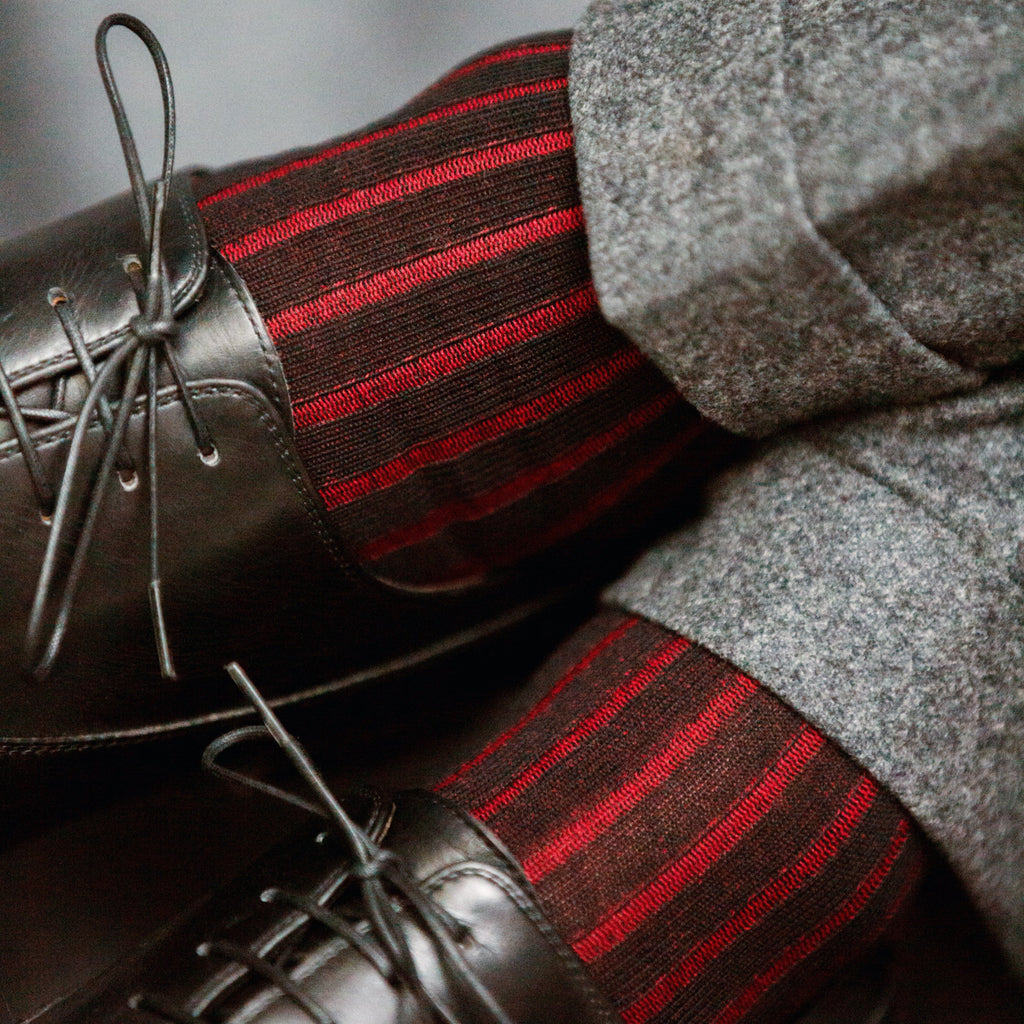 Si vous recherchez la sobriété avec une touche d'originalité, cette paire de chaussettes mi-mollet est idéale. Le noir est ici réhaussé par des rayures rouges vif, pour un motif à la fois vif et pouvant aisément s'accorder dans une tenue formelle aux tons sombres.