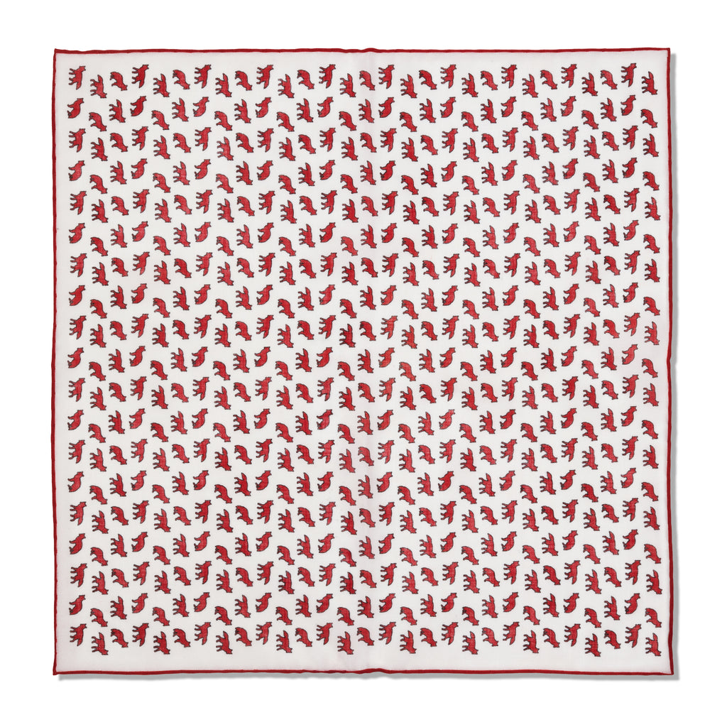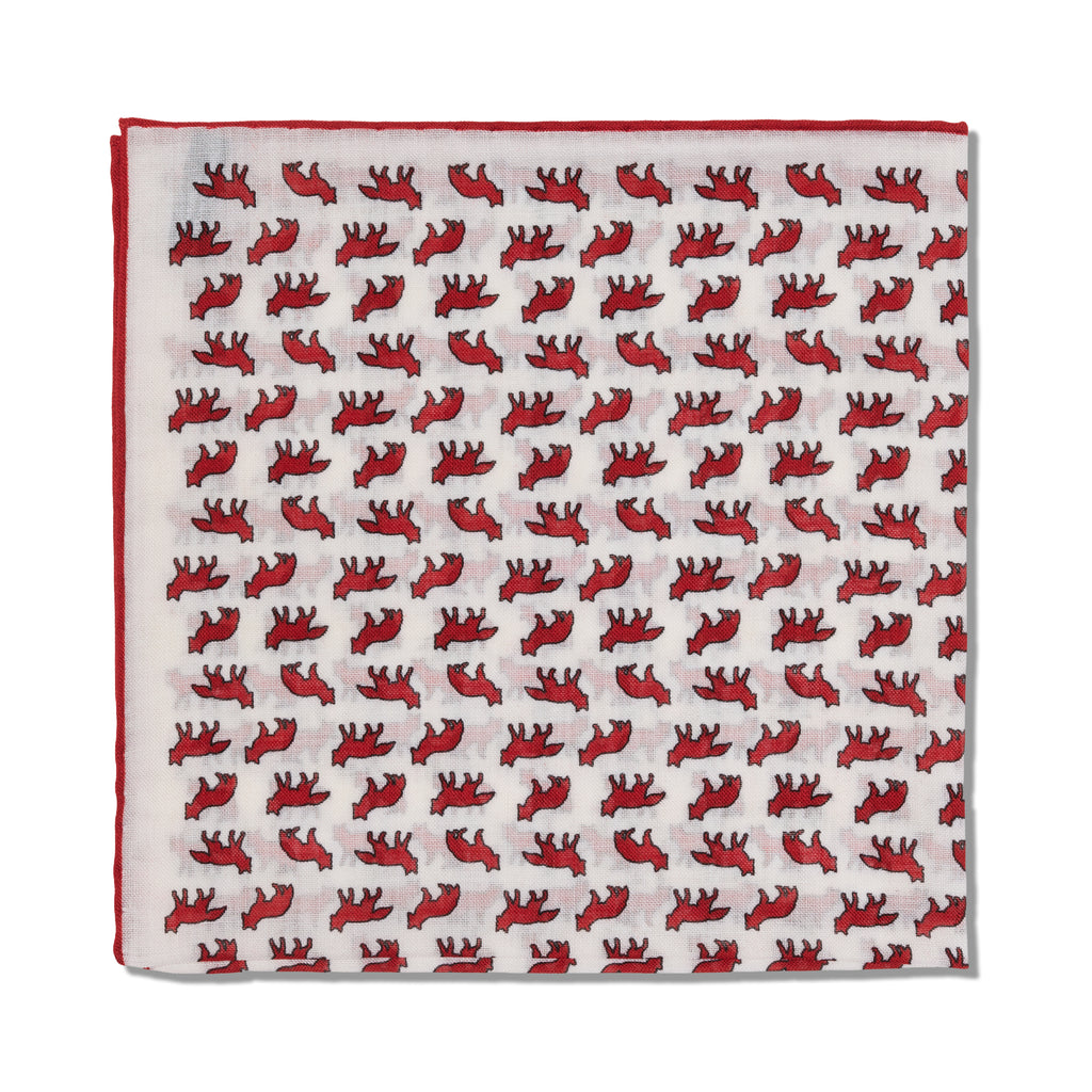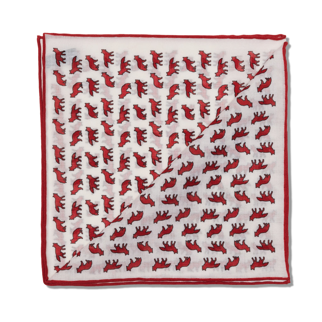 Pochette de costume en laine et soie de couleur blanc neige à motif animal de renards rouges, de la marque Mazarin.