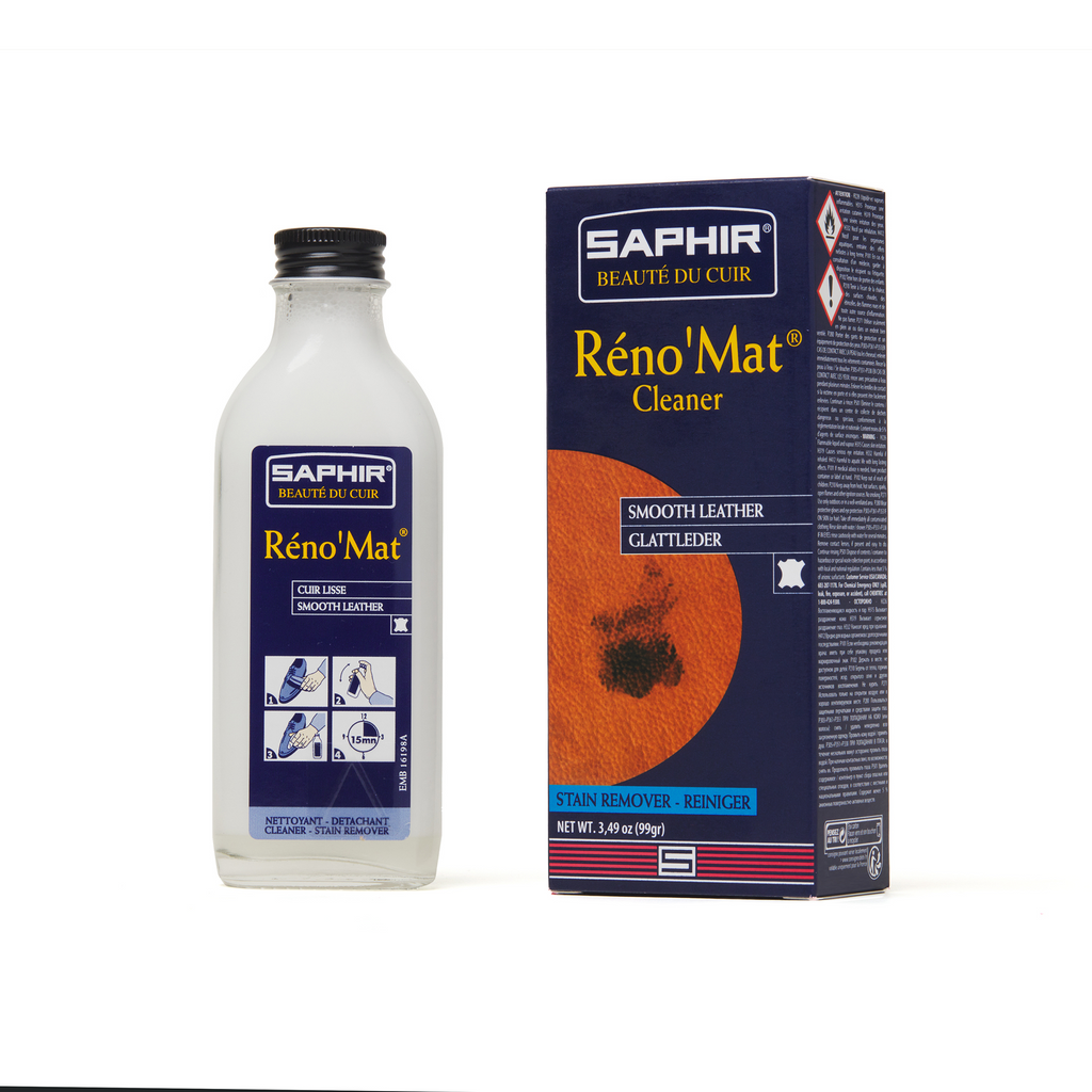 Le Réno'mat de la maison Saphir est idéal pour nettoyer en profondeur tous vos cuirs lisses. Il permet de détacher les salissures et dépôts de produits à base de résine ou de silicone mais également de dissoudre les différentes couches de cirages qui se trouvent sur le cuir de vos chaussures afin de retrouver le cuir d'origine.