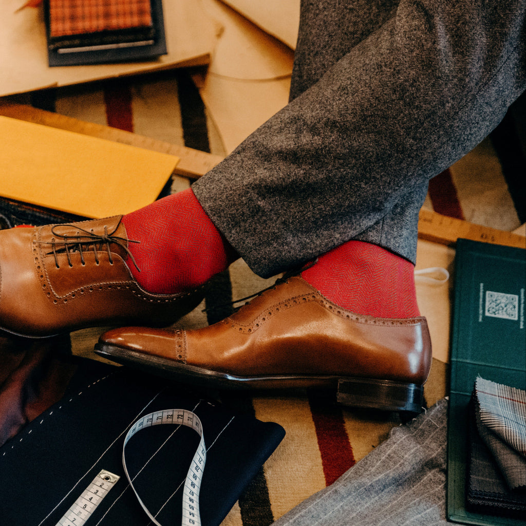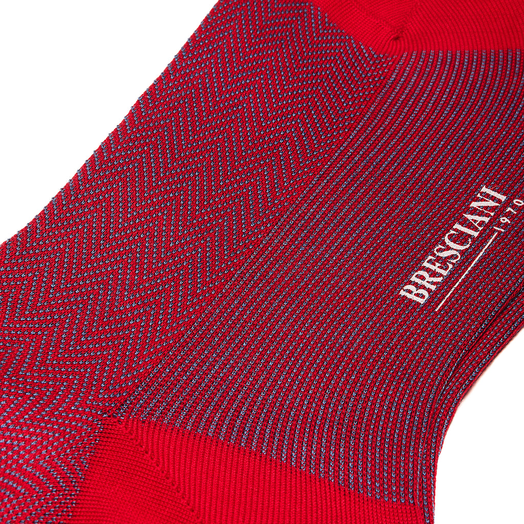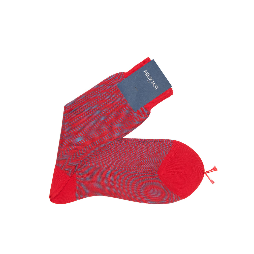 Ces chaussettes Bresciani sont fabriquées en Italie. Vous apprécierez ses chevrons rouge vif et bleu ciel, qui sauront égayer vos élégantes tenues. Ce sont des chaussettes mi-hautes, qui arrivent à hauteur du mi-mollet.