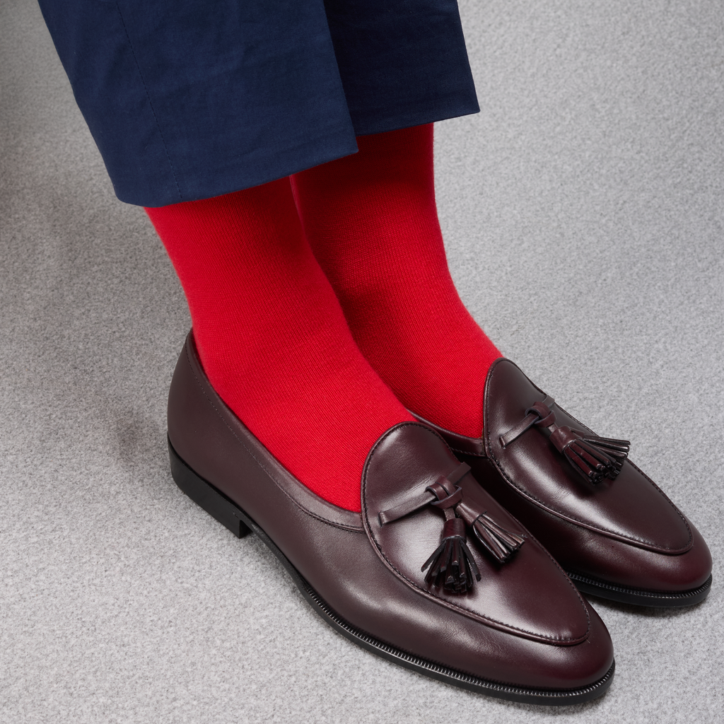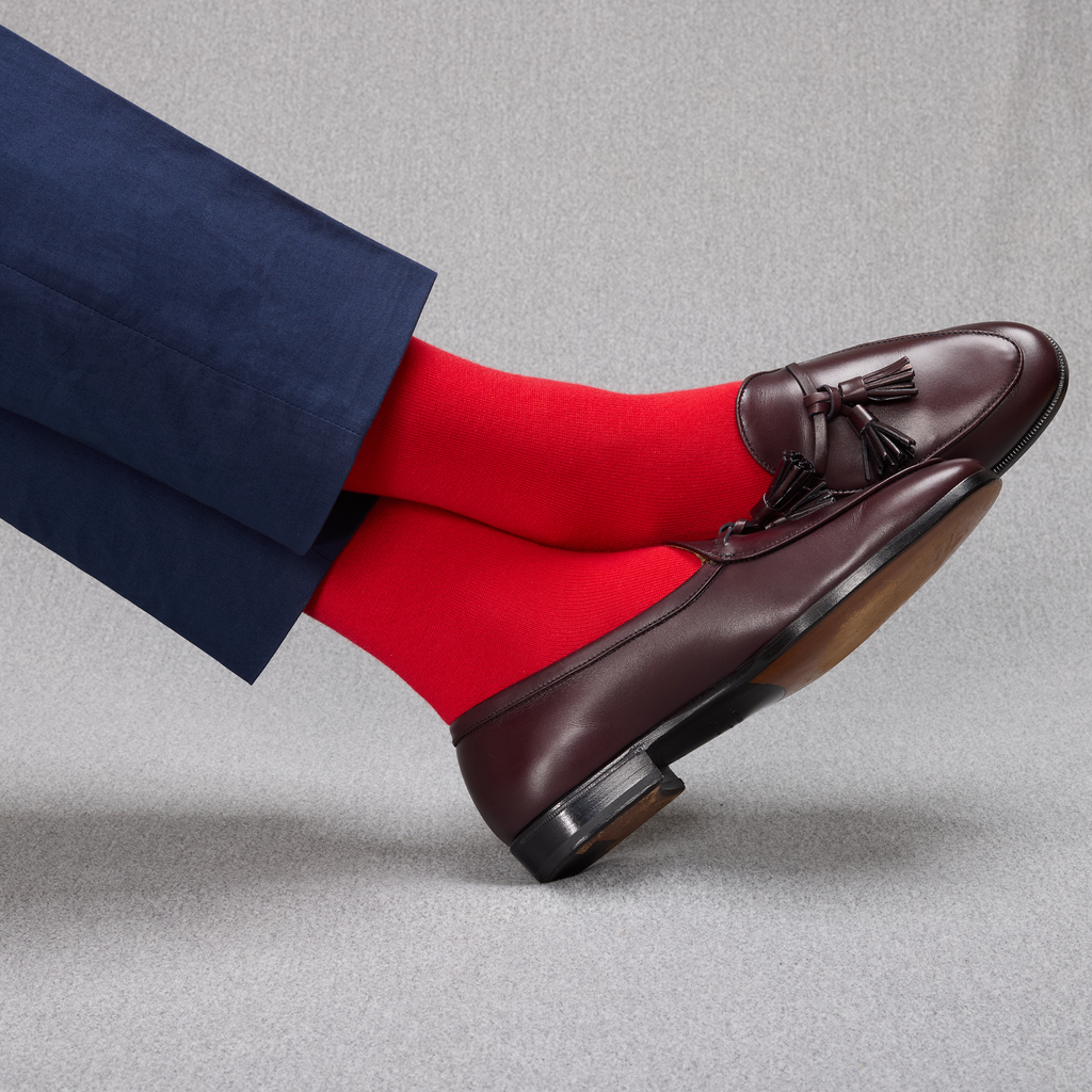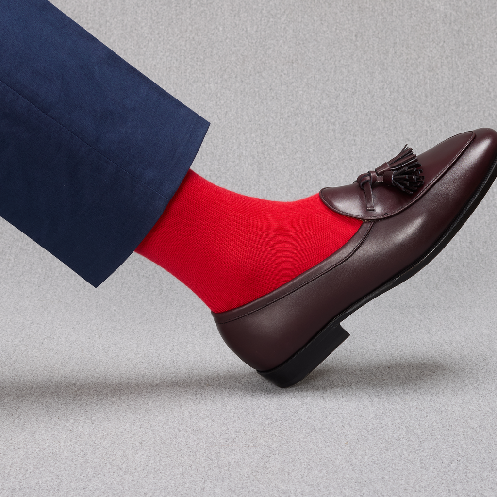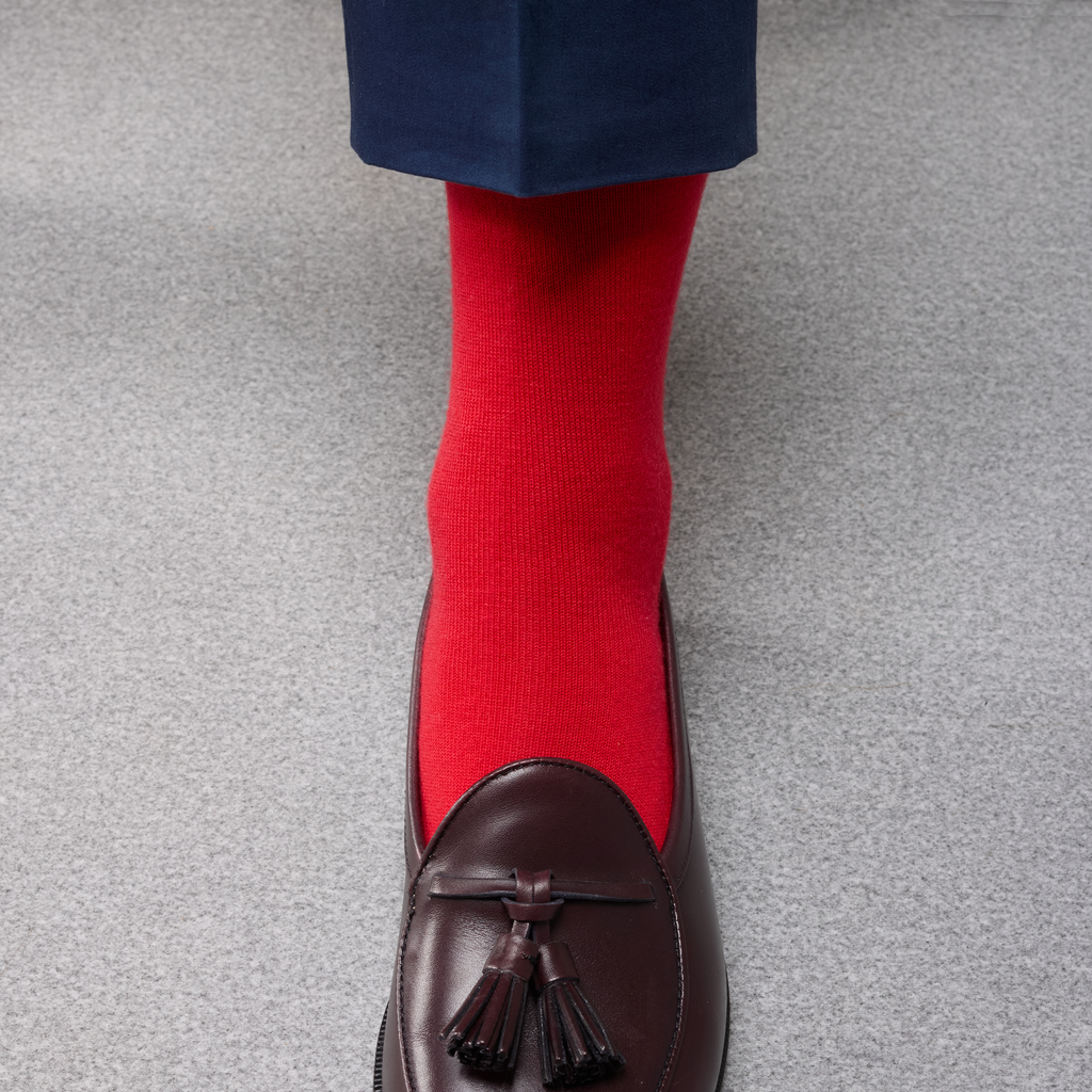 Notre incontournable et élégante paire de chaussettes rouges est ici déclinée dans une teinte rouge vif qui illumine vos tenues et y apporte une touche d'originalité. Vous pourrez aisément porter ces chaussettes rouges avec un style formel ou décontracté, portées avec un jean, un chino, ou des tons sobres comme le gris, le marine ou le marron.