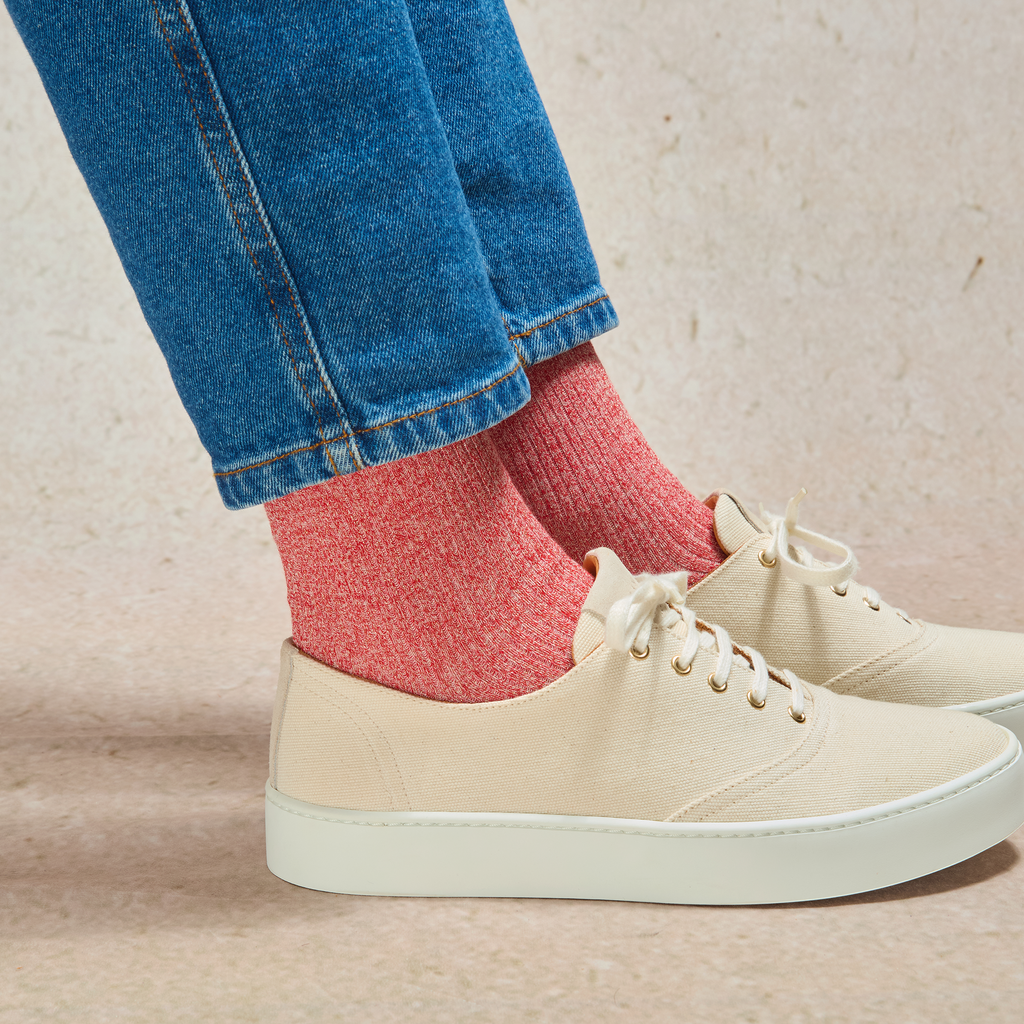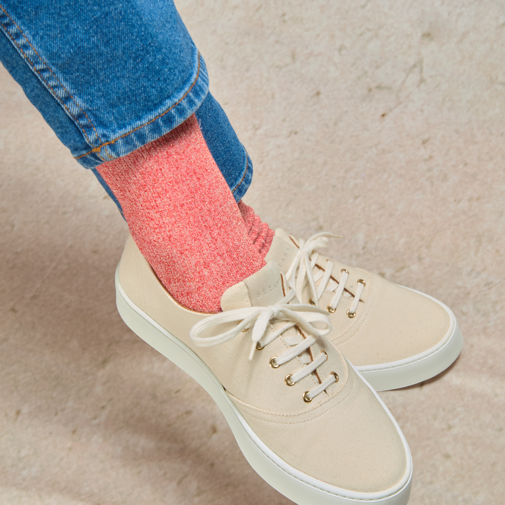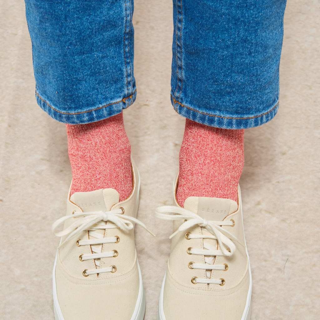 Cette couleur rouge pailletée s'accordera facilement avec des jeans clairs, des pantalons beiges ou encore des couleurs plus foncées comme du gris pour faire ressortir les contrastes et mettre en avant le détail fantaisie pailleté. Coup de cœur pour l'association chaussettes pailletées rougeet baskets blanches !