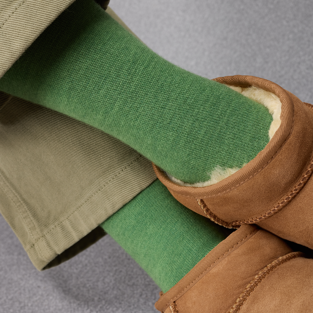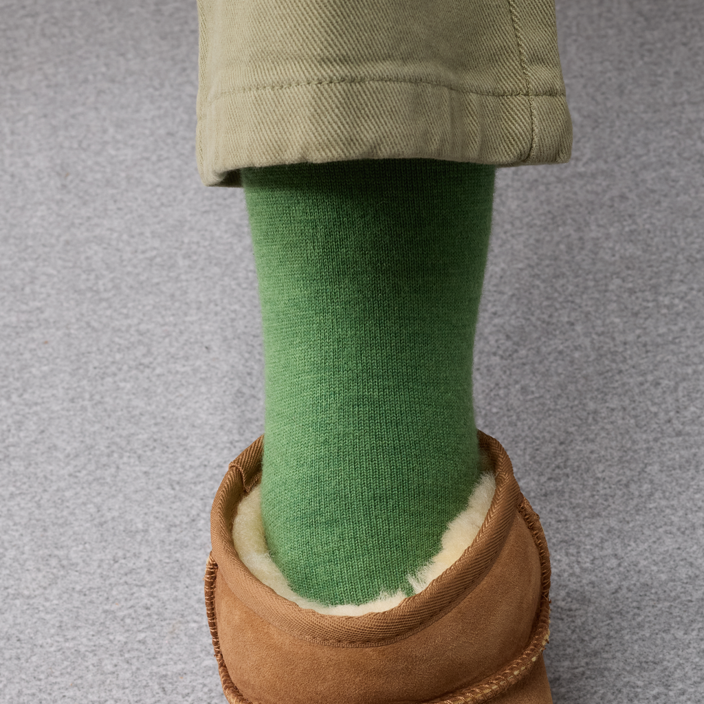 Ces chaussettes hautes en laine et cachemire pour femme se distinguent par leur couleur vert prairie, une teinte vive qui s'accorde parfaitement avec des tenues aux tons bruns, bleus pour un look décontracté.